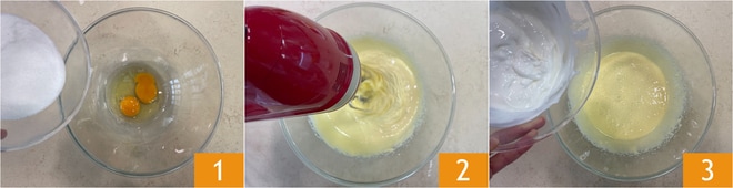 Pour préparer le gâteau sans levure, commencez par casser les œufs dans un bol, ajoutez le sucre 1 et battez avec un fouet électrique 2. Ajoutez le yaourt, de préférence à température ambiante 3.