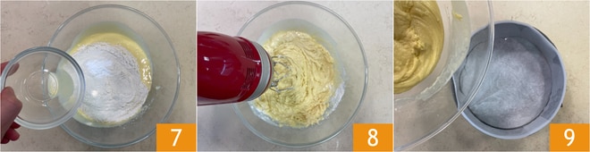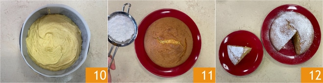Nivelez 10 et faites cuire au four statique à 170°C pendant 30-35 minutes. Laissez refroidir, démoulez et décorez avec du sucre glace 11. Votre gâteau sans levure est prêt à être dégusté 12 !