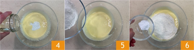 Continuez avec l'huile de graines 4, la farine 5 et le bicarbonate 6.