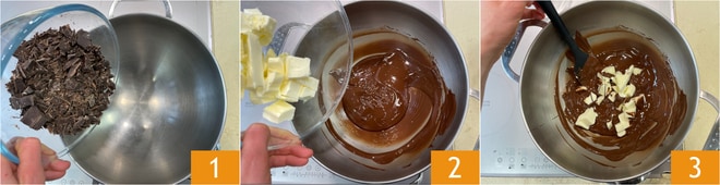 Pour préparer la torta tenerina aux framboises, commencez par faire fondre le chocolat au bain-marie 1. Ajoutez le beurre salé coupé en morceaux 2 et laissez-le fondre complètement 3.