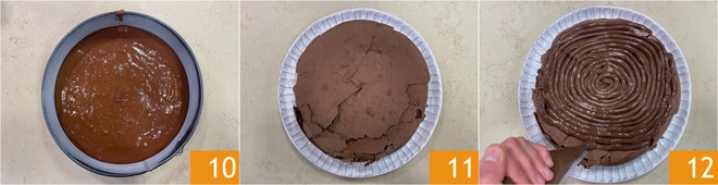 Beurrez et farinez un moule à charnière de 25 cm de diamètre, versez-y le mélange et égalisez la surface 10. Faites cuire dans un four statique à 180°C pendant 25-30 minutes. Sortez du four 11 et laissez refroidir. Transférez le gâteau sur un plat et décorez avec de la crème de noisettes 12.
