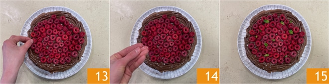Ajoutez ensuite les framboises 13, le sel de Maldon 14 et quelques feuilles de menthe. Votre torta tenerina aux framboises est prête à être servie 15.