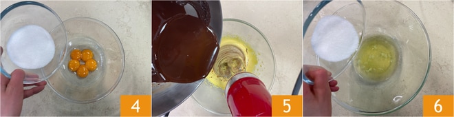 Séparez les jaunes des blancs d'œufs et placez-les dans deux bols. Ajoutez la moitié du sucre 4 aux jaunes et battez avec un batteur électrique jusqu'à obtenir un mélange mousseux. Incorporez le chocolat fondu en filet tout en continuant à battre 5. Ajoutez le sucre restant aux blancs d'œufs 6.