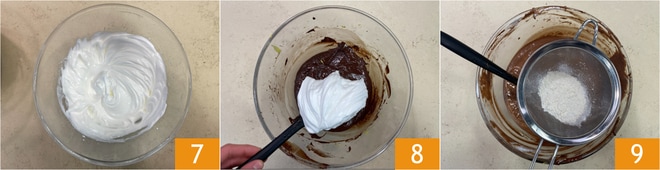 Montez-les en neige ferme avec des fouets propres et secs 7. Ajoutez les blancs au mélange au chocolat 8 et incorporez avec des mouvements de haut en bas pour ne pas casser les blancs. Ajoutez la farine tamisée 9 et mélangez délicatement, toujours avec des mouvements de haut en bas.