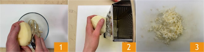 Pour réaliser les galettes de pommes de terre, commencez par peler les pommes de terre blanches 1. Râpez-les avec une râpe à gros trous 2 3.
