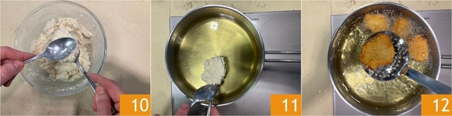 Avec l'aide d'une autre cuillère 10, faites glisser la pâte dans l'huile bouillante 11 et faites frire jusqu'à ce qu'elle soit dorée 12. Immergez quelques morceaux à la fois, pour éviter de faire baisser la température de l'huile.