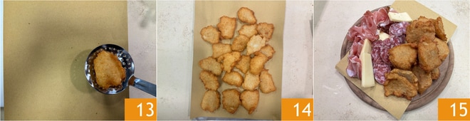 Égouttez les galettes sur un plateau recouvert de papier absorbant 13. Procédez de cette manière jusqu'à épuisement de la pâte, avec ces quantités vous obtiendrez environ 30 galettes 14. Servez immédiatement vos galettes, accompagnées d'une planche de charcuteries et de fromages 15!