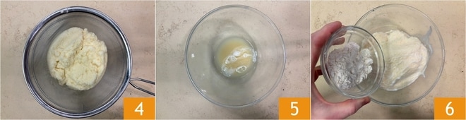 Transférez les pommes de terre râpées dans une passoire 4, pour éliminer l'eau de végétation 5; le mélange doit être sec. Ajoutez maintenant la farine 6.