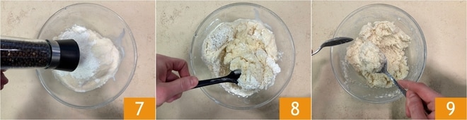Salez, poivrez 7 et mélangez avec une cuillère 8 pour obtenir une pâte homogène. Faites cuire les galettes immédiatement : chauffez l'huile de graines dans une petite casserole jusqu'à atteindre la température de 170°. Prélevez une cuillère à soupe de pâte 9.