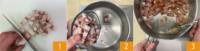 Pour préparer les tortelli à la carbonara, commencez par la farce : coupez le guanciale en lanières 1, mettez-le dans une poêle 2, allumez à feu doux et faites-le rissoler jusqu'à ce qu'il soit doré. Pendant qu'il cuit, récupérez la graisse de la poêle et mettez-la de côté 3.