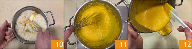 Mélangez le tout avec le fouet 10, puis remettez sur le feu au bain-marie et faites cuire jusqu'à atteindre à nouveau 60°, en remuant continuellement 11. Une fois prêt, goûtez et ajustez éventuellement le sel. Transférez la crème obtenue dans un pichet 12.