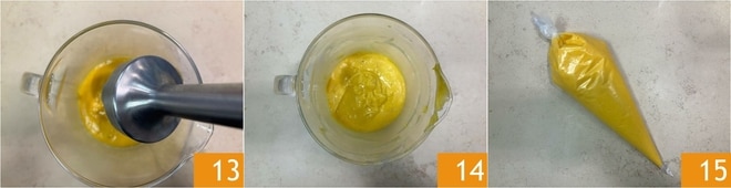 Mélangez avec le mixeur plongeant 13 pour obtenir une sauce lisse et homogène 14. Transférez la farce dans une poche à douille sans embout 15 et laissez reposer au réfrigérateur pendant au moins 8 heures.