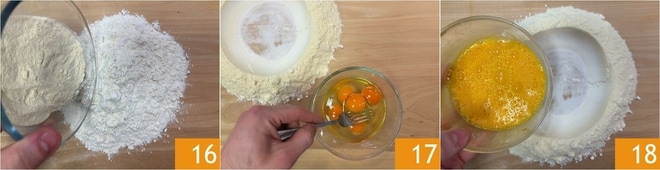 Pour préparer les pâtes fraîches, placez la farine et la semoule sur un plan de travail 16, mélangez-les et créez le classique puits. Battez les œufs 17 et versez-les au centre 18.