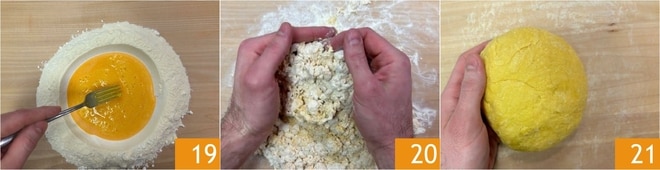 Commencez à pétrir avec une fourchette pour rassembler les ingrédients 19. Puis continuez à pétrir à la main, en vous aidant d'un coupe-pâte 20. Lorsque vous aurez obtenu une pâte lisse, ferme et homogène, formez une boule 21. Couvrez de film plastique et laissez reposer au réfrigérateur pendant une heure.