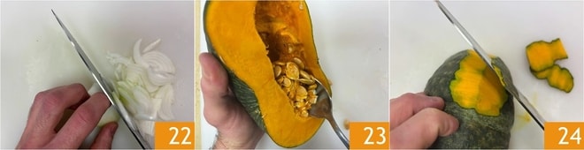 Préparez la crème de potiron : épluchez et émincez l'oignon en julienne 22. Nettoyez le potiron en éliminant les graines internes 23 et la peau 24.
