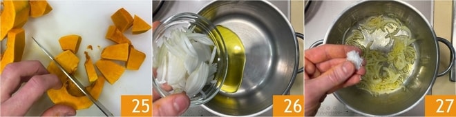 Puis coupez 400 g de pulpe en morceaux grossiers 25. Dans une casserole, chauffez un filet d'huile, ajoutez les oignons 26 et faites-les suer avec une pincée de sel jusqu'à ce qu'ils soient tendres 27.