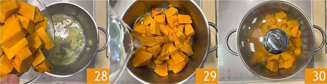 Ajoutez le potiron coupé en cubes 28, versez un verre d'eau 29 et faites cuire avec le couvercle pendant environ 15 minutes 30, jusqu'à obtenir un potiron cuit mais sec.