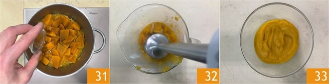 Quand le potiron sera cuit mais sec, ajoutez le vinaigre 31, poivrez et faites cuire encore 2 minutes. Mélangez le mélange avec le mixeur plongeant 32, puis passez-le au tamis pour obtenir une crème lisse et soyeuse 33.