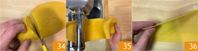 Reprenez la pâte, prélevez une portion 34 et enveloppez le reste dans du film plastique pour éviter qu'elle ne sèche. Étalez la pâte avec un rouleau pour l'affiner suffisamment pour la passer dans le rouleau de la machine à pâtes 35. Passez la pâte plusieurs fois en réduisant progressivement l'épaisseur jusqu'à obtenir la plus fine, elle doit être presque transparente 36.