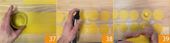 Découpez des disques avec un emporte-pièce de 8 cm de diamètre 37. Vaporisez les feuilles de pâte avec de l'eau 38 (ou badigeonnez avec un pinceau de cuisine) et déposez au centre une petite noix de farce 39.