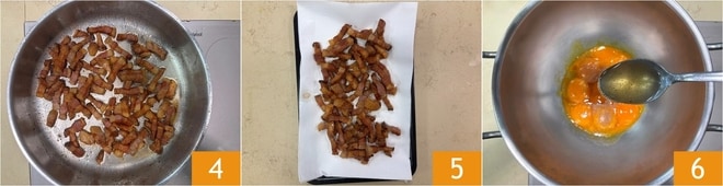 Quand le guanciale sera bien doré 4, laissez-le s'égoutter sur du papier absorbant 5. Dans un bol en métal, mélangez les jaunes d'œufs, un peu de sel, beaucoup de poivre et une partie de la graisse de guanciale mise de côté 6. Placez le bol au bain-marie sur le feu.