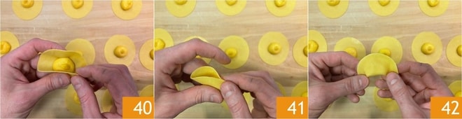Maintenant, formez les tortelli : pliez les feuilles en deux 40 en pressant bien les bords 41, de manière à créer des demi-lunes 42.