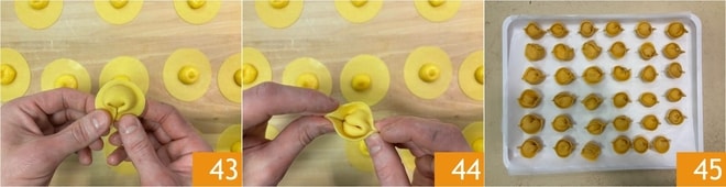 Maintenant, rejoignez les extrémités 43 en pinçant les bords des deux côtés 44. Disposez les tortelli sur un plateau légèrement fariné à la semoule 45. Vous obtiendrez environ 80 tortelli avec ces quantités.