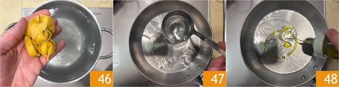 Faites cuire les tortelli dans de l'eau bouillante pendant 1,5 à 2 minutes maximum 46. Pendant ce temps, dans une poêle, versez une louche de l'eau de cuisson 47 et un filet d'huile 48.