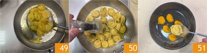 Égouttez les tortelli ici 49, poivrez et faites-les sauter pendant quelques instants 50. Dans l'assiette de service, formez des quenelles avec la crème de potiron, puis disposez les tortelli 51.