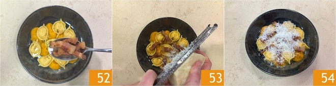 Complétez avec le guanciale 52 et le Pecorino râpé 53. Servez immédiatement vos tortelli à la carbonara faits maison 54!