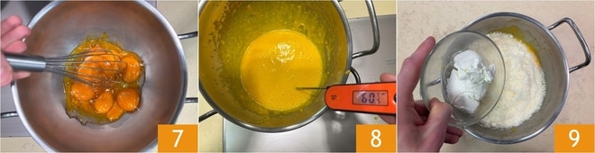 Battez avec un fouet à main 7 jusqu'à obtenir un mélange dense, semblable à une sabayon ; vous devrez atteindre 60° pour obtenir la consistance parfaite 8. Hors du feu, ajoutez le Parmesan, le Pecorino et le mascarpone 9.