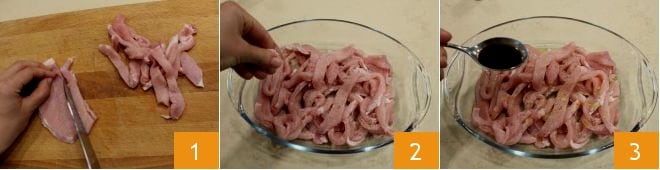 Pour préparer les tortillas avec porc épicé et guacamole au yaourt, commencez par mariner la viande : coupez les tranches de porc en lanières 1 puis mettez-les dans un saladier et ajoutez le sel 2, le poivre, la sauce Worcestershire 3,