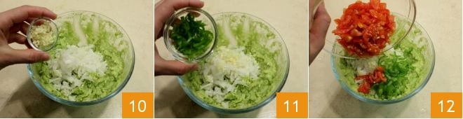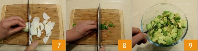 Épluchez l'oignon et coupez-le en fines tranches 7 puis hachez-le finement ; hachez également le piment vert 8, l'ail et coupez les tomates cerises en quartiers. Écrasez avec les dents d'une fourchette la chair d'avocat dans le bol 9 jusqu'à obtenir une purée crémeuse.