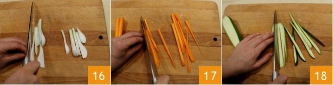 Épluchez et émincez finement l'oignon vert 16, coupez, épluchez et coupez les carottes en fines lanières 17, puis lavez et coupez les courgettes pour les réduire également en lanières 18.