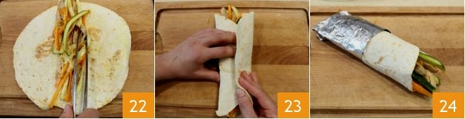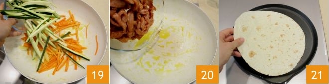 Dans une poêle, versez la moitié de l'huile et ajoutez l'oignon vert et les carottes ; mélangez avec une cuillère en bois et faites sauter les légumes pendant 2-3 minutes, puis ajoutez également les courgettes 19 et continuez la cuisson pendant encore 5 minutes, salez et poivrez à votre goût : les légumes doivent s'imprégner mais rester croquants. Dans une autre poêle, versez l'autre moitié de l'huile et faites cuire la viande que vous aviez fait mariner 20, pendant 10 minutes. Faites chauffer les tortillas, environ 1 minute et demie de chaque côté, dans une poêle à crêpes ou dans une poêle antiadhésive bien chaude 21.