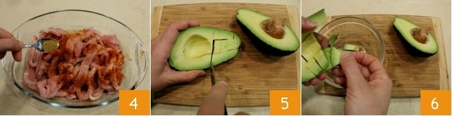 le paprika, le cumin 4 et un filet d'huile. Mélangez et laissez reposer pour que la viande s'imprègne ; pendant ce temps, préparez la sauce guacamole au yaourt : ouvrez l'avocat et coupez la chair en dés 5, mettez-en 3/4 dans un bol 6, tandis que l'autre partie peut être réservée pour être ajoutée entière à la sauce.
