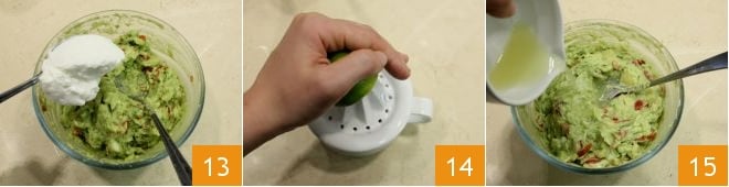 puis ajoutez également le yaourt grec 13. Pressez le jus du citron vert 14, filtrez-le et ajoutez-le à la sauce guacamole 15, ajoutez aussi les dés d'avocat que vous avez réservés et, si nécessaire, versez encore un filet d'huile d'olive. Mélangez et conservez la sauce au réfrigérateur.
