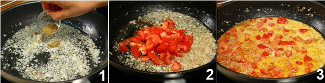 Préparez la sauce : émincez finement les échalotes et l'ail, faites chauffer de l'huile dans une poêle et faites blondir, ajoutez le cumin et laissez libérer les arômes 1; ajoutez les tomates 2 coupées en morceaux et épépinées, faites cuire quelques minutes à feu doux.