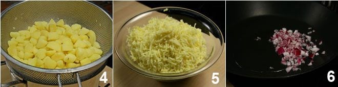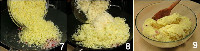 ajoutez les pommes de terre écrasées 7 et le fromage râpé 8, faites cuire quelques instants puis transférez dans un saladier 9