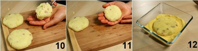 prenez une cuillère de mélange à la fois 10 et formez des galettes plates avec l'aide de vos mains 11, passez-les bien dans la farine de maïs 12 afin qu'elles restent croustillantes à la cuisson.