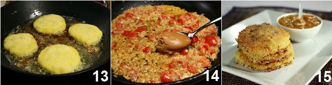 Ces galettes de pommes de terre avec une sauce aux arachides sont caractérisées par des saveurs sud-américaines, très riches et consistantes ; la particularité des galettes de pommes de terre avec une sauce aux arachides est la crème d'accompagnement qui mélange des saveurs sucrées comme le beurre d'arachide et salées comme les tomates et le piment.