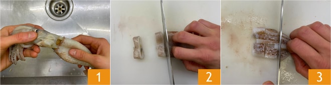 Pour préparer les calmars au four, commencez par vous occuper du Comment nettoyer les calmars. Rincez-les sous un jet d'eau courante, puis séparez la tête du manteau 1. Retirez la plume, la petite tige de cartilage à l'intérieur du manteau. Prenez la tête et enlevez les yeux, les entrailles et le bec, qui se trouve au centre des tentacules. Retirez la peau du manteau et des tentacules et rincez à nouveau sous l'eau courante. Coupez le manteau en rondelles 2 et les tentacules en morceaux 3.