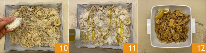 Mettez-les dans un plat recouvert de papier sulfurisé, saupoudrez de parmesan râpé 10 et arrosez d'huile 11. Faites cuire au four statique à 180°C pendant 20 minutes, puis en mode grill pendant 5 minutes supplémentaires. Les calmars au four sont prêts à être dégustés 12, si vous le souhaitez, après la cuisson, vous pouvez les assaisonner avec du sel à votre goût.