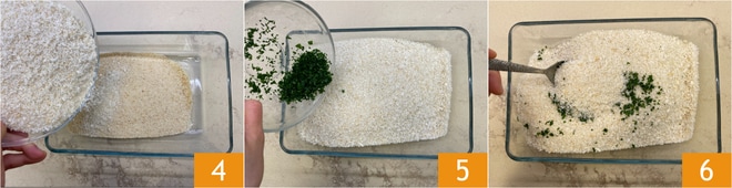 Dans un bol, mettez la chapelure, ajoutez le panko 4, le persil 5 et mélangez le tout 6.