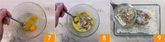 Dans un autre bol, battez les œufs 7, puis passez les calmars d'abord dans l'œuf 8 puis dans la panure 9.