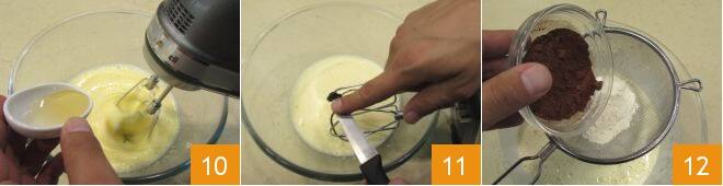 Toujours avec le batteur en marche, ajoutez le miel 10 et lorsque la pâte sera homogène, arrêtez le batteur, ajoutez les graines de la gousse de vanille 11. Tamisez la farine et le cacao amer à l'intérieur 12.