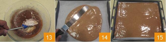 Mélangez délicatement avec une spatule pour incorporer les poudres 13. Maintenant que la pâte est prête, étalez-la sur une plaque recouverte de papier sulfurisé en nivelant avec une spatule 14. Enfournez dans un four déjà chaud à 220°C pendant environ 12 minutes 15.