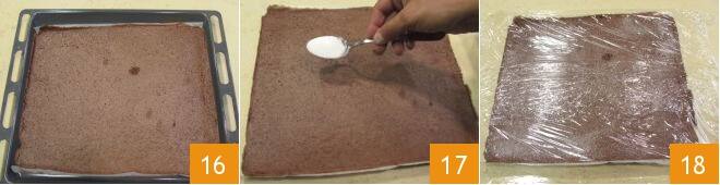 Une fois la base cuite 16, saupoudrez de sucre en poudre 17, puis couvrez d'un film alimentaire et laissez-la ainsi pendant une heure 18.