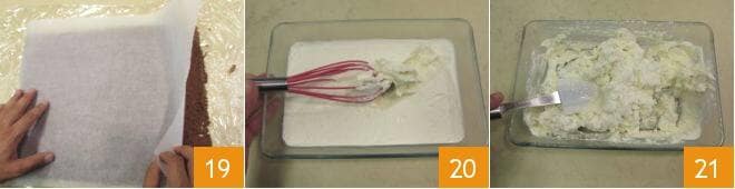 Ensuite, retournez la base encore chaude pour retirer très délicatement le papier sulfurisé 19, placez dessus une nouvelle feuille de papier sulfurisé et laissez refroidir. Cette procédure permettra de garder la base moelleuse une fois refroidie. Lorsque la pâte biscuit sera refroidie, sortez la crème du réfrigérateur, brisez-la avec le fouet 20 et travaillez-la pour l'assouplir 21.