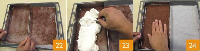 Coupez la pâte biscuit en deux 22, égalisez les bords. Ensuite, placez sur une moitié un cadre réglable. Étalez la crème sur une moitié de la base 23 puis placez dessus l'autre base, sans presser 24. Couvrez d'un film alimentaire et laissez raffermir au réfrigérateur pendant une heure.